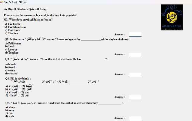 This software is the pdf copy of the Quiz Surah Al Falaq Question paper and the answers in .exe file need to download at computers or laptops with Windows environment.